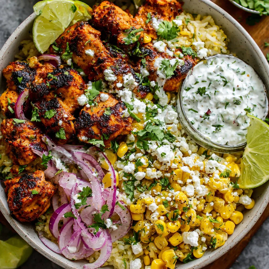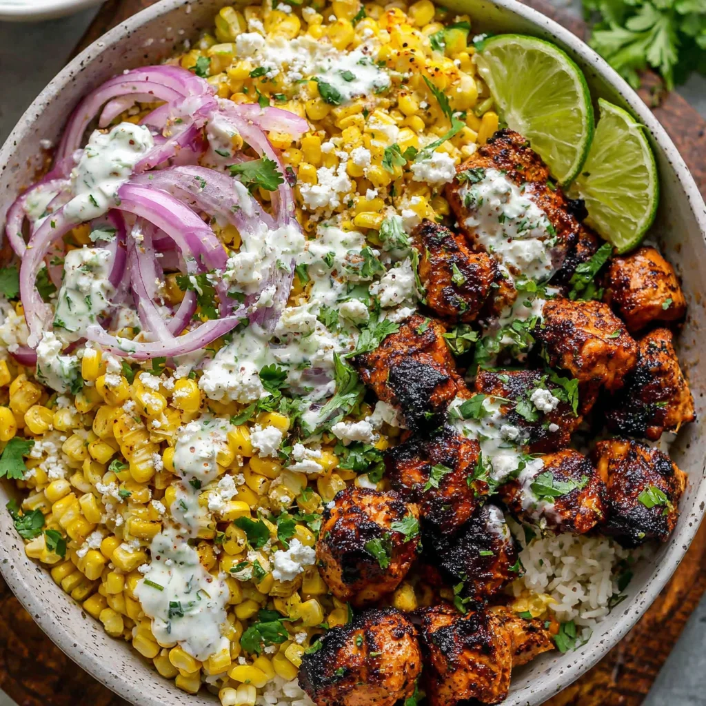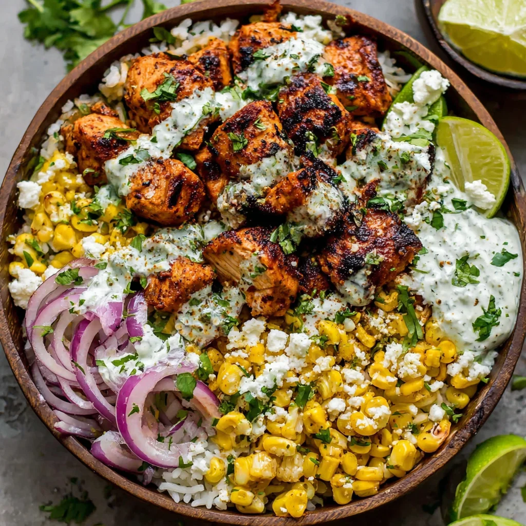 - Assemble the bowls. Divide the warmed rice among your serving bowls, creating a comforting base. Arrange the sliced chicken (from the Fourth Step) over the rice. Spoon a generous amount of the creamy street corn topping (from the Sixth Step) alongside the chicken.