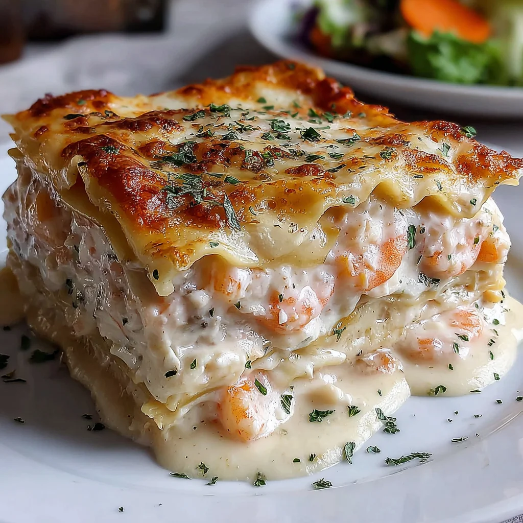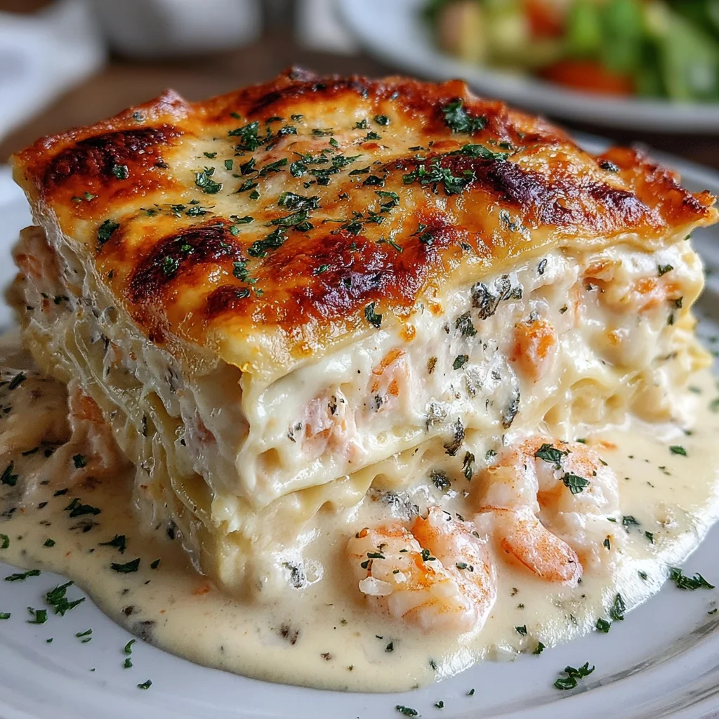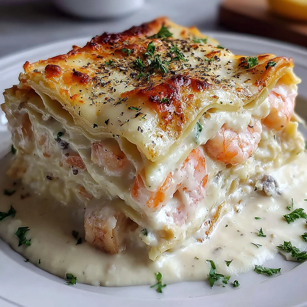 Contains shellfish (shrimp, crab, scallops), dairy (butter, cream, Parmesan, ricotta, mozzarella), and gluten (flour, lasagna noodles). For a gluten-free version, use certified gluten-free lasagna noodles and ensure all other ingredients are gluten-free. For a dairy-free version, substitute dairy products with plant-based alternatives, though this will significantly alter the flavor and texture.