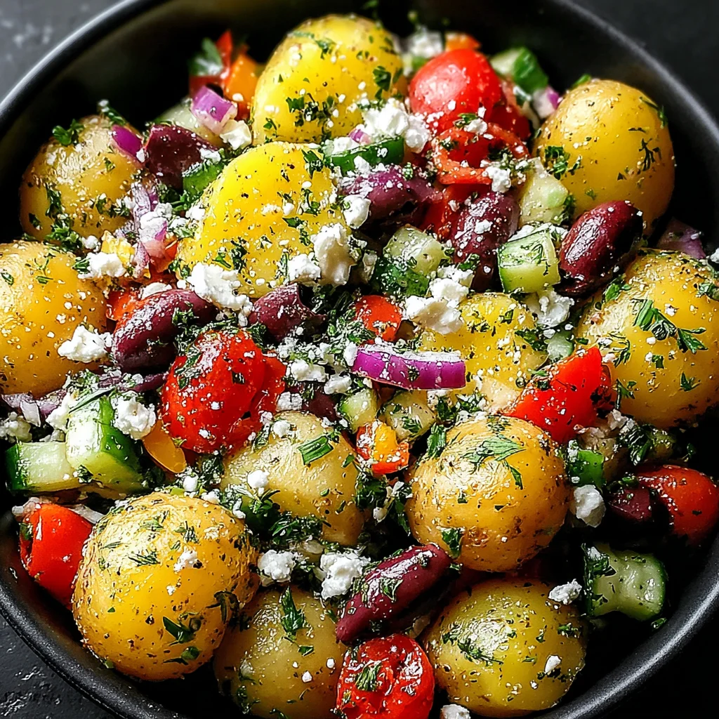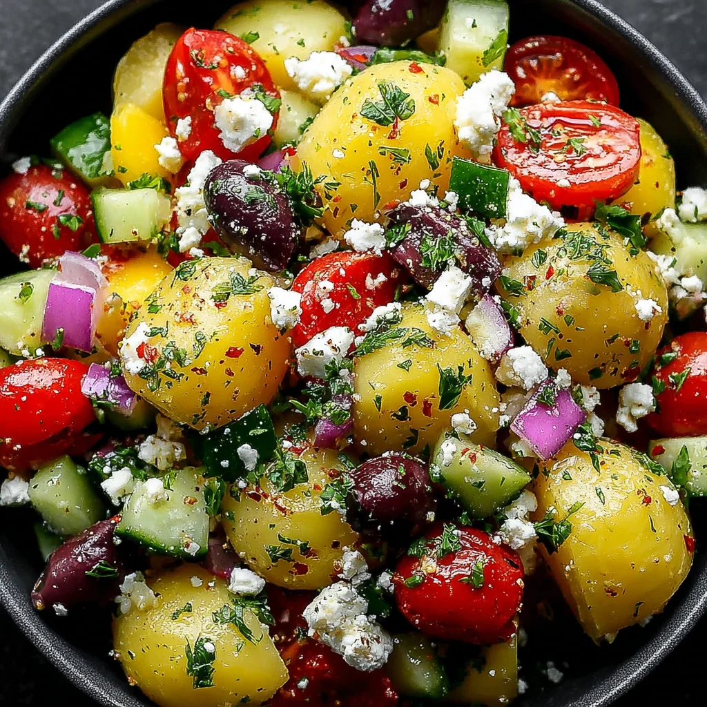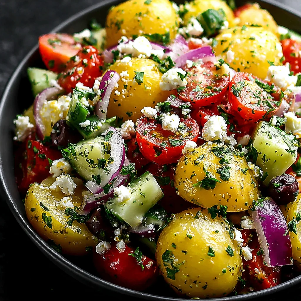 - In a large mixing bowl, gently combine the cubed potatoes with the finely chopped fresh parsley, diced red onion, diced cucumber, diced tomatoes, chopped black olives, and the crumbled feta cheese. Handle the potatoes with care to maintain their shape.