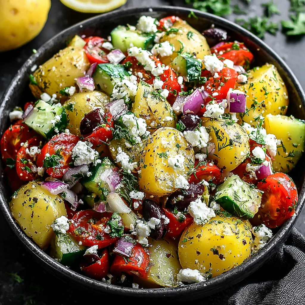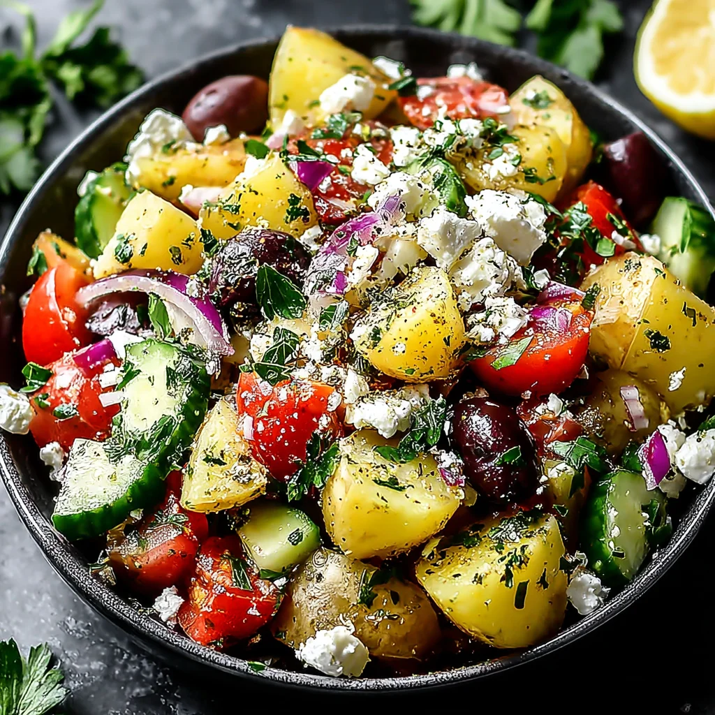 - In a large mixing bowl, combine the cubed potatoes with the finely chopped fresh parsley, finely diced red onion, diced English cucumber, seeded and diced ripe tomatoes, chopped black olives, and the crumbled feta cheese. The variety of colors and textures will make the salad visually appealing.