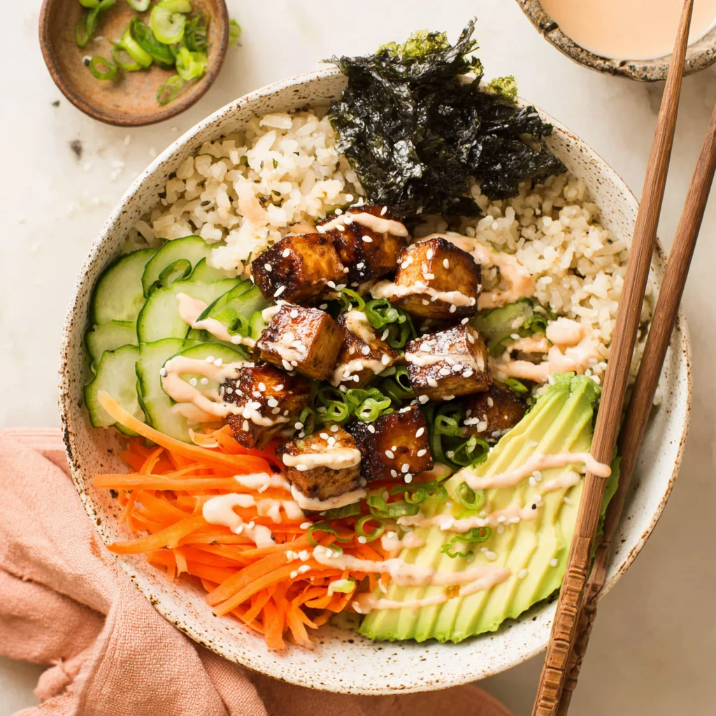 - To assemble the sushi bowls, divide the cooked rice evenly among three serving bowls. Artfully arrange the baked sesame tofu, julienned carrots, sliced cucumbers, avocado slices, and nori squares on top of the rice. Drizzle generously with the sriracha mayo dressing. Finish by sprinkling with sliced scallions and vegan rice seasoning or toasted sesame seeds. Serve immediately with additional soy sauce or a pinch of salt on the side, if desired.